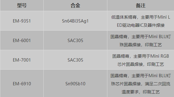 EM-6001 series Mini solid crystal solder paste is made of high-purity lead-free Sn96.5Ag3Cu0.5 alloy (6#, 7#, 8# powder) and precision flux. It still has good printability and demoulding properties at fine pitch pad sizes as low as P0.1, and there is no collapse or solder bridge short circuit after reflow soldering, meeting the electrical parameter requirements of high precision and high reliability.