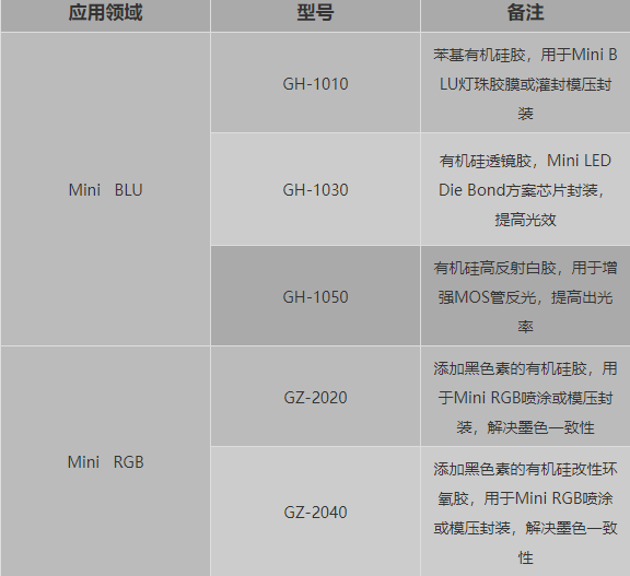 Min LED encapsulant uses two material systems: silicone and silicone-modified epoxy resin. The unique modified material system simultaneously solves the pain points of weak adhesive force of silicone and easy yellowing of epoxy system at high temperatures, and can meet the different application needs of Mini LED backlight and display.